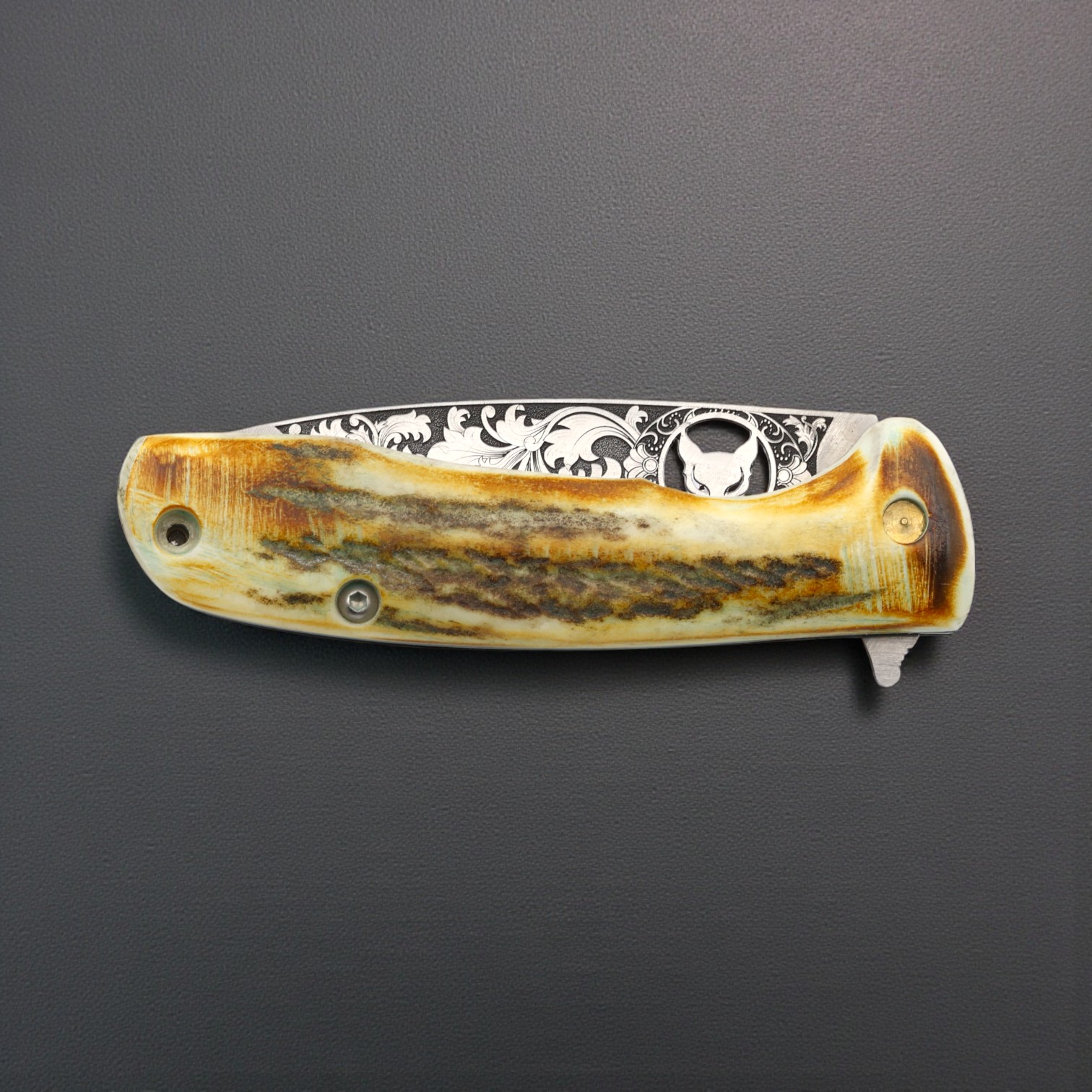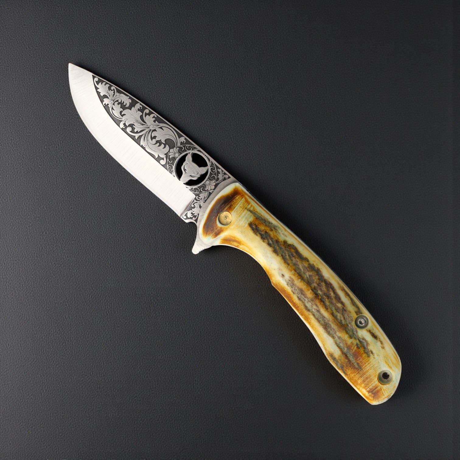 El Yapımı Kurt İşlemeli Çakı Geyik Boynuzu Kabza